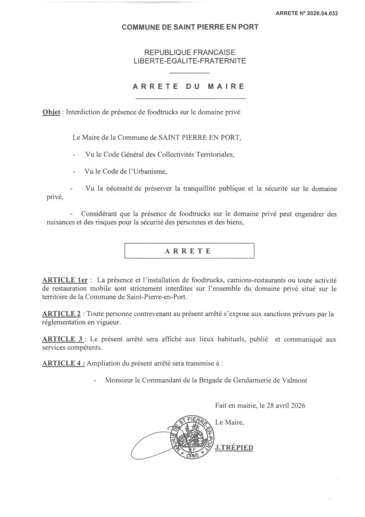 Arrêté communal interdisant la présence de foodtrucks sur le domaine privé